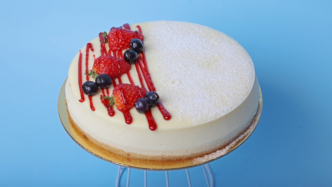 გამომცხვარი ჩიზქეიქი, რომელიც ზემოდან დაფარულია შაქრის პუდრით.
